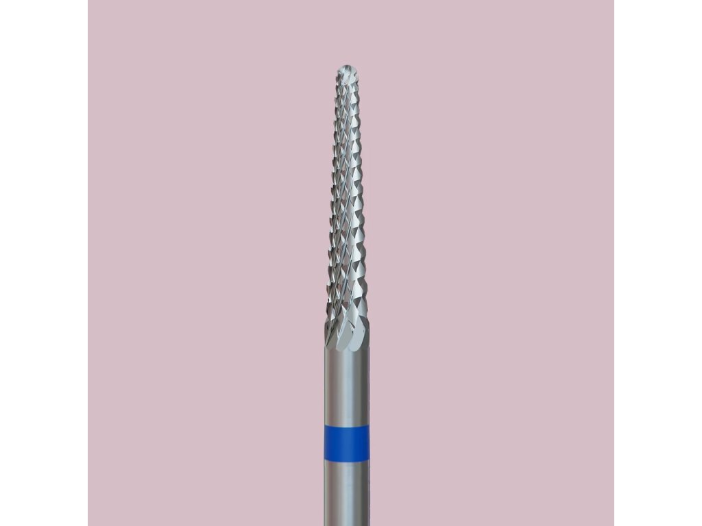 Fréza z karbidu nachádza uplatnenie tak v kozmetológii, ako aj v podológii. Tvar – kužeľ a modrý pruh z nej robia ideálny nástroj na spracovanie kožičiek.